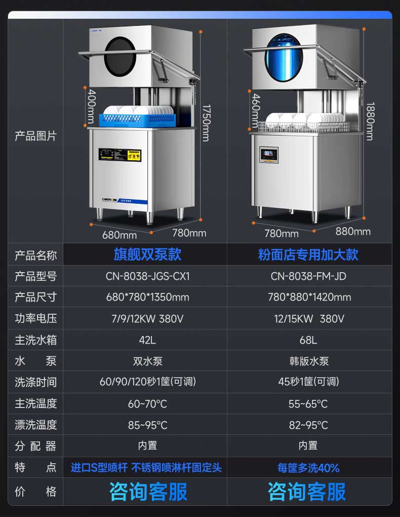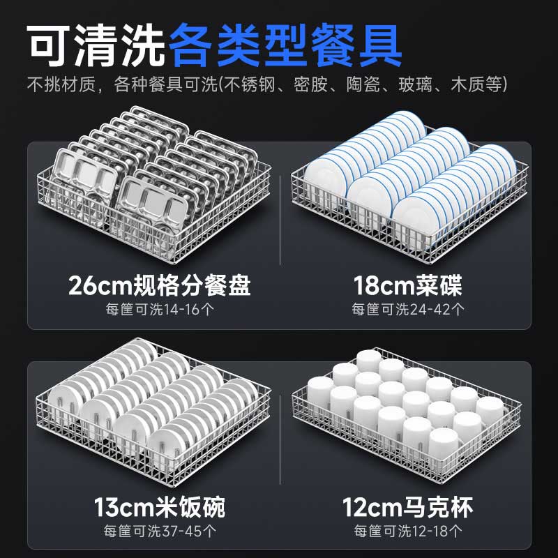 内置高达7.5kg冲洗水压强力水泵,强劲动力喷淋效果好;独特的喷淋臂及内凹防堵塞喷嘴,出水均匀,清洗无死角;45S/60S/90S/120S多档清洗模式,满足不同需要的清洗要求;整体碗筐支架,中心“零”遮挡,清洗更彻底。
