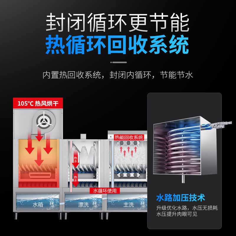 采用循环用水技术和自动控水设计,减少水资源浪费;内置热回收系统可降低能耗。