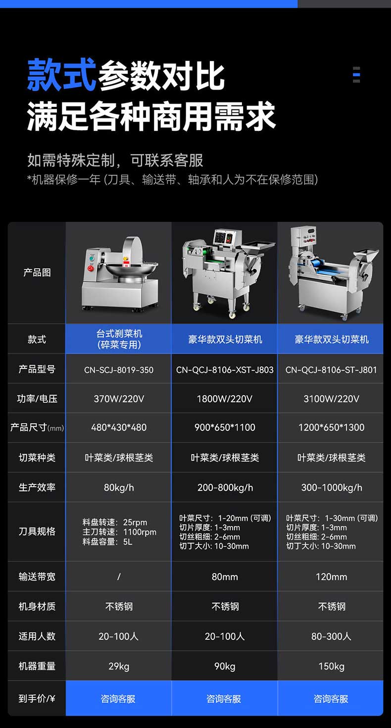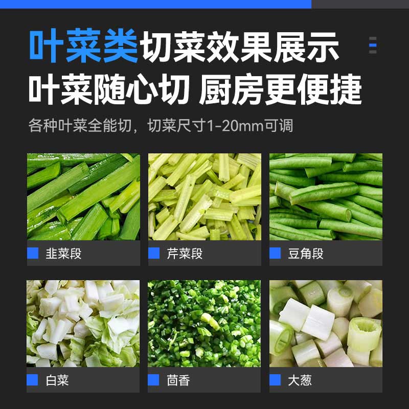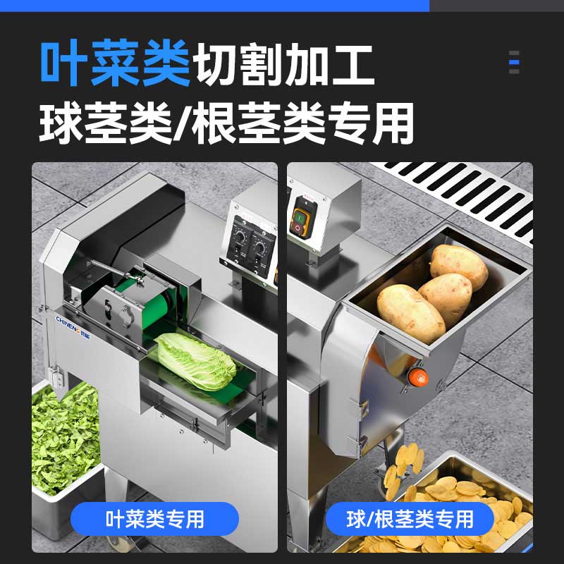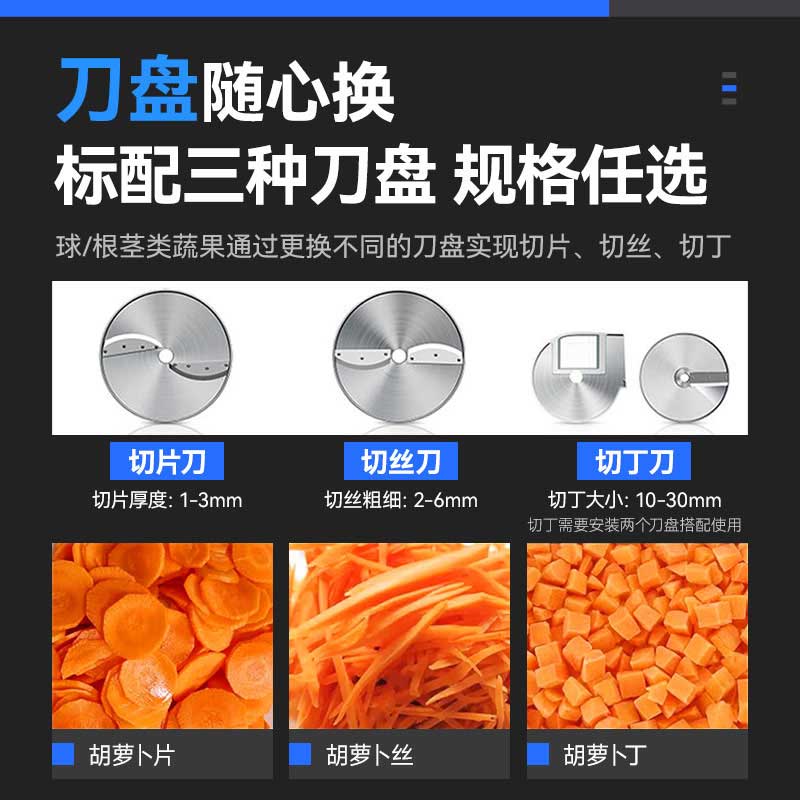 叶菜类双频变速调节,可切段、切粒;球根茎类标配三把刀盘轻松切换,切片/切丝/切丁尺寸可调,切出多种形状,操作简单,标准化切菜。