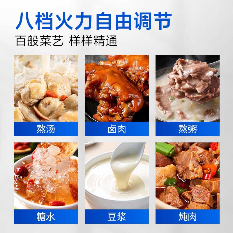 内置八段位智能火力控制系统,从文火慢炖到武火猛攻,精准调控每一度温度。无论是需要持续沸腾的熬汤、卤煮,还是需要小火慢炖的滋补品、粥品,皆能轻松胜任,一机覆盖后厨多种炖煮需求。