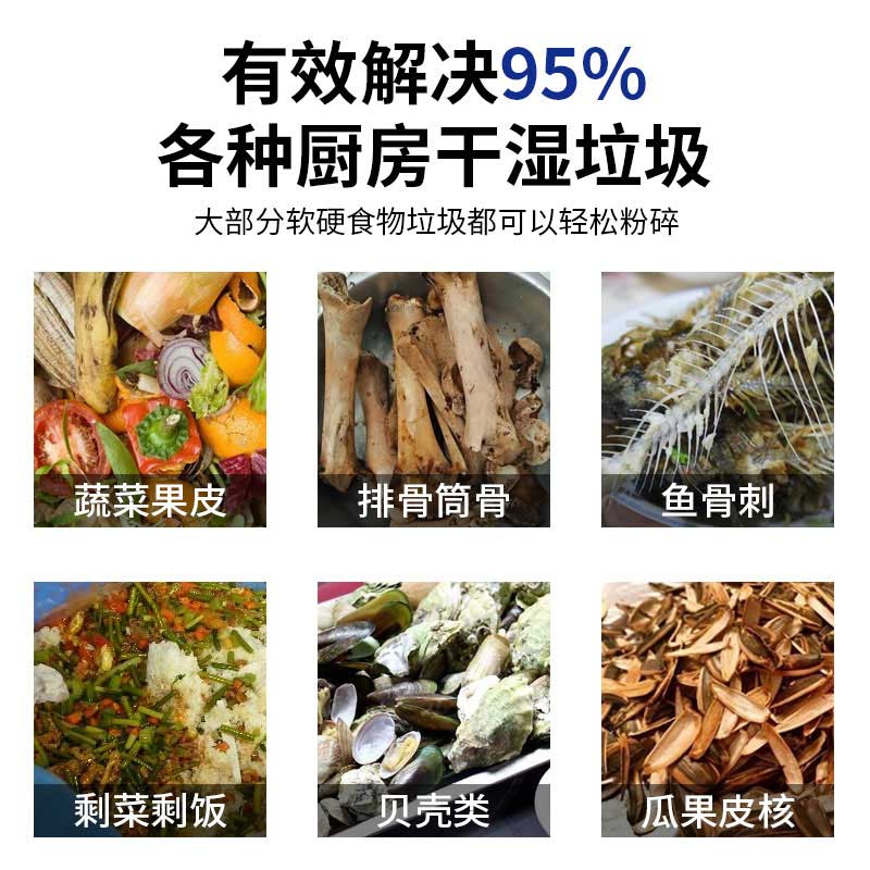 高效处理,全面应对:能有效解决厨房中绝大部分干湿垃圾,包括蔬菜果皮、排骨筒骨、鱼骨刺、剩菜剩饭、贝壳类、瓜果皮核等。